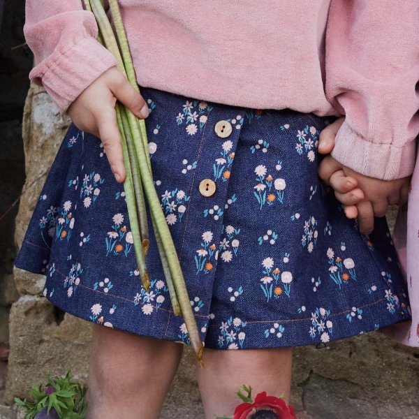 Na revista Cottagecore de Katia Fabrics Outono-Inverno 22/23 encontra moldes para costurar blusas, calças e vestidos com este tecido ganga.