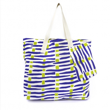 Tecido canvas 100% algodão com um padrão abstrato linear fluorescente azul e amarelo sobre fundo creme. Um tecido perfeito para fazer bolsas, mochilas, almofadas e acessórios.