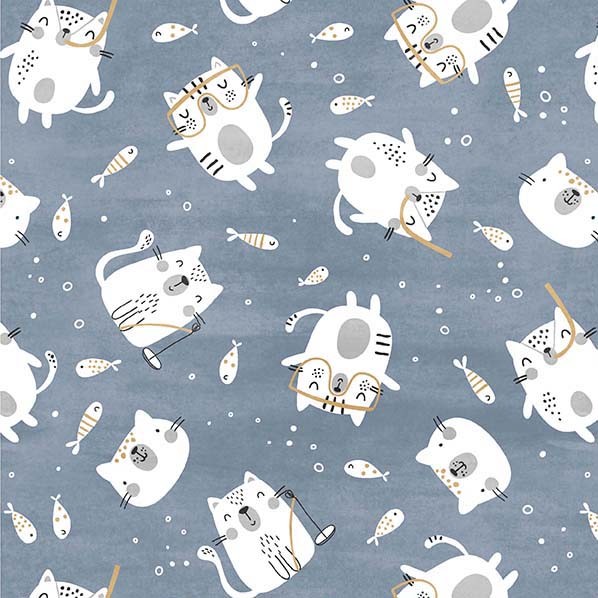 Gatos vão pescar? Por que não!? Estes amigos gatos encontraram o seu caminho para esta adorável coleção de tecidos. O passatempo improvável traz uma boa e divertida energia para qualquer projeto.