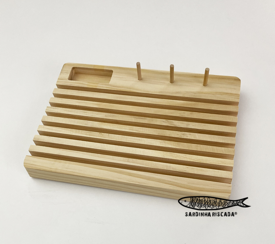 Suporte organizador de madeira com capacidade para 8 réguas e 3 carrinhos de linhas